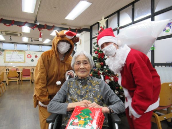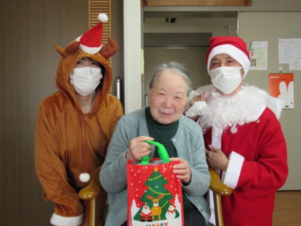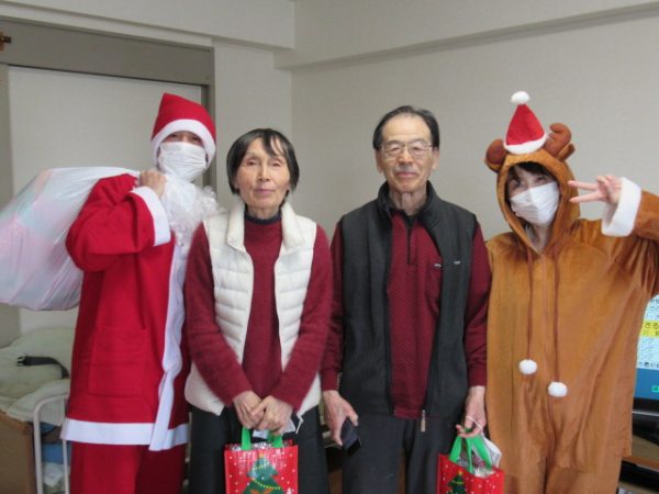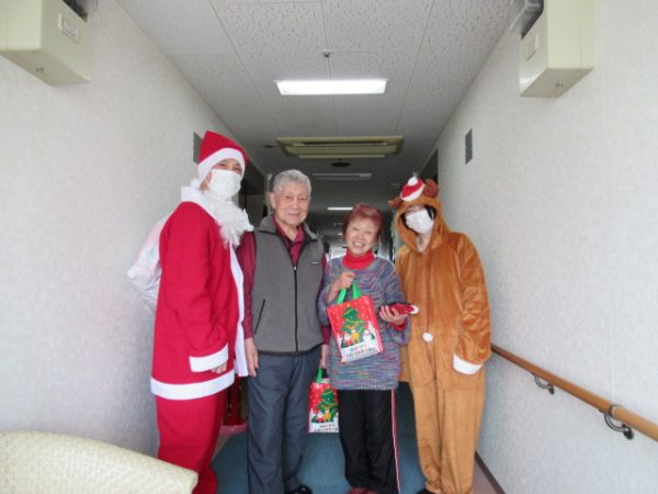 サンタクロースとトナカイに変装した介護職員が